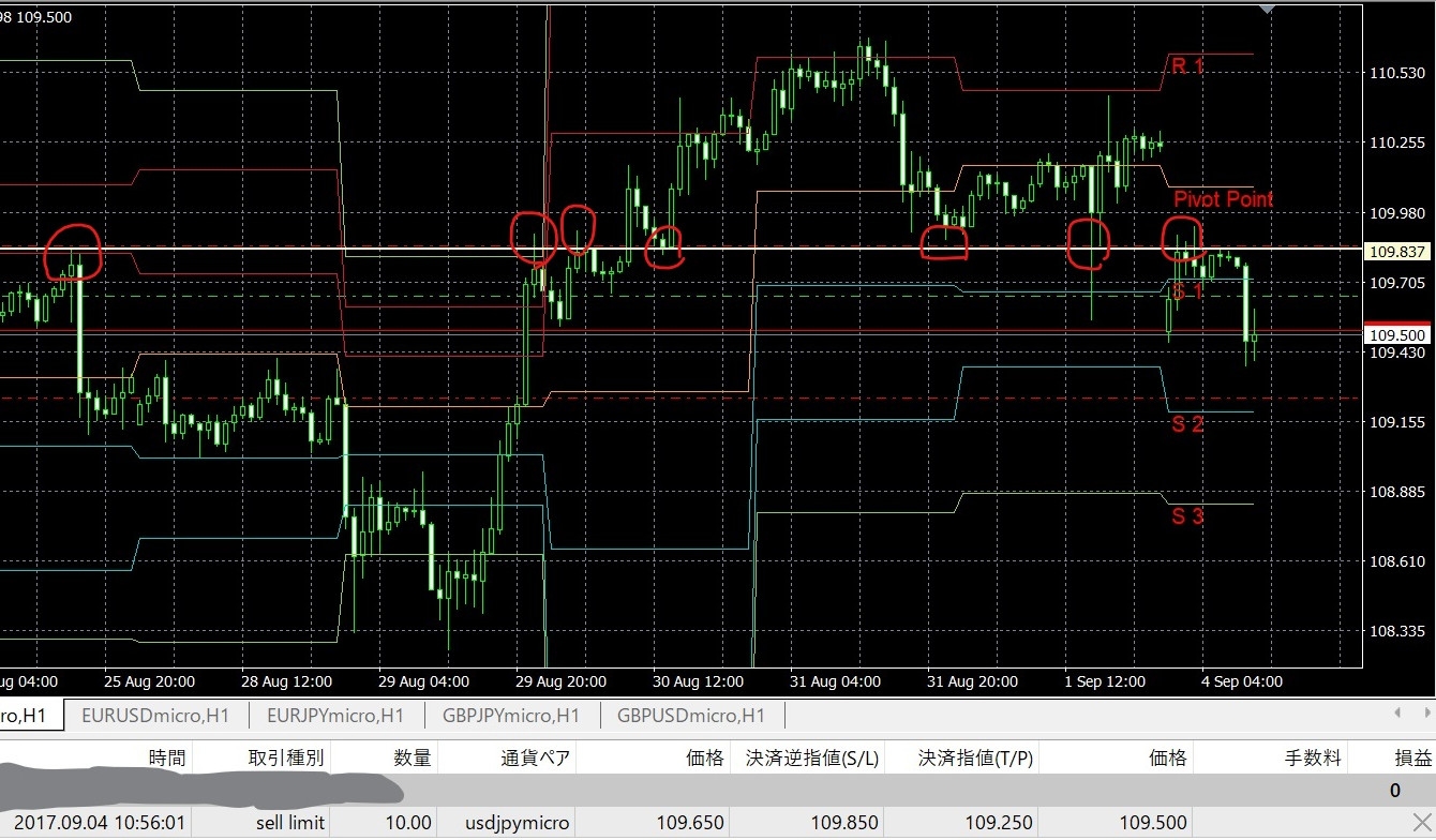 それが、白い水平線が引かれたあたり(109.837)です。1時間足で見てみると、過去にサポートラインやレジスタンスラインとして意識されている価格帯だと気が付きました(赤い丸で示しているあたり)