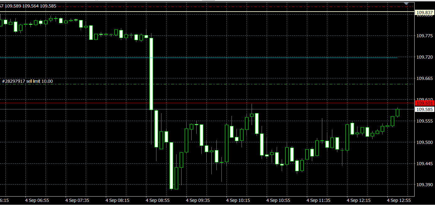 エントリーポイントにかかりました。10lot、109.653でSELLエントリーです。エントリー後もレンジ相場が続きました。
