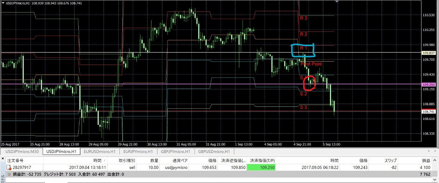 利食いポイントは、直近のピボットラインに置くことにしているので、S2のちょっと上あたりに設定。【利益確定ポイント→109.250】