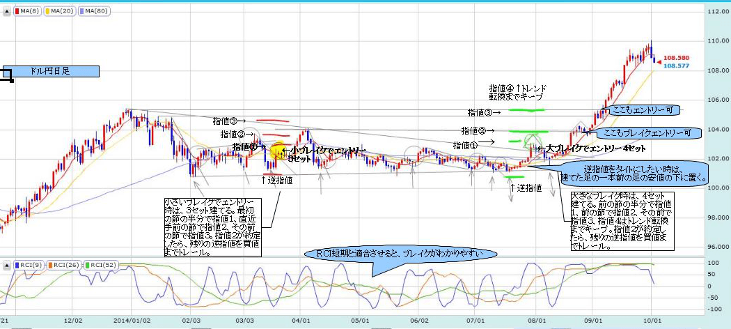 チャートに表示しているのは、ボリンジャーバンド、移動平均線、オシレーターにRCI、あとは、自分でトレンドラインを引いています。