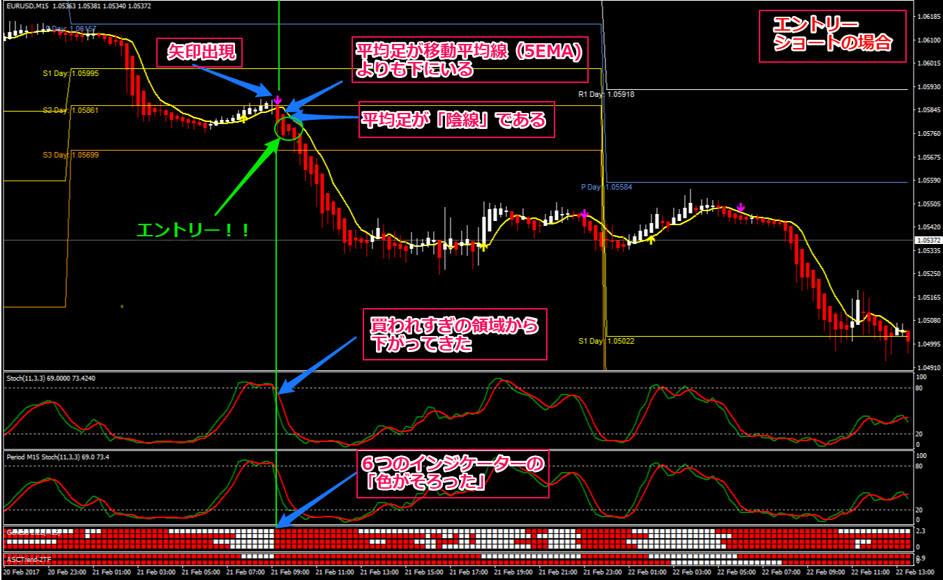 上からMA13、MA21の順番で、MAが少しでも上向きなこと。押し目となるショート方向のローソク足がMA21(MA13)で反応し、次の足が陽線であるのを確認。