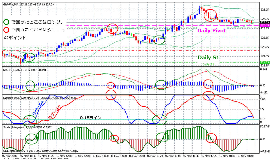 4.ローソク足が水平線(H1)付近で反応する動きを監視し、反発の可能性が大きい場合にはMACDを監視します。