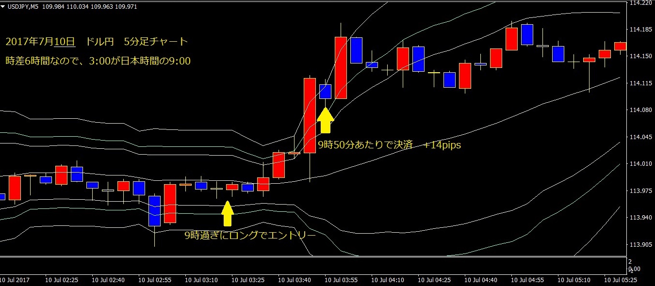 チャート画像をご覧ください。5分足を主体としてエントリーをしています。