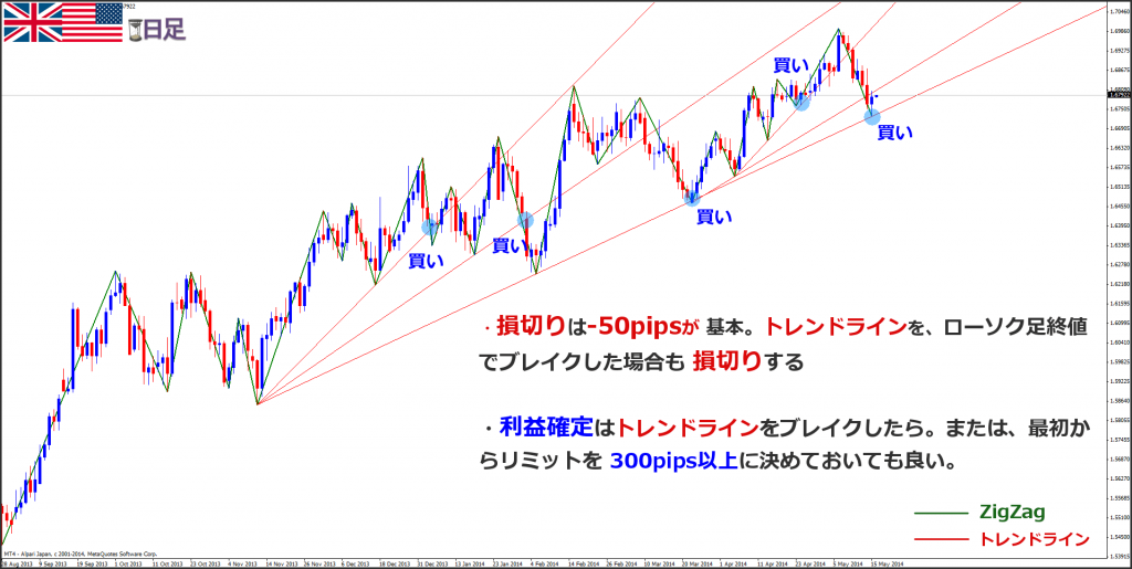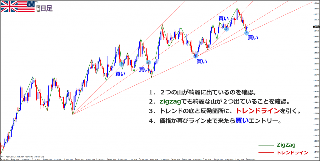 日足のトレンドラインは、多くのFX投資家が見ているラインだが、それに、zigzagを付け加える事で、エントリーポイントを明確にする効果がある。