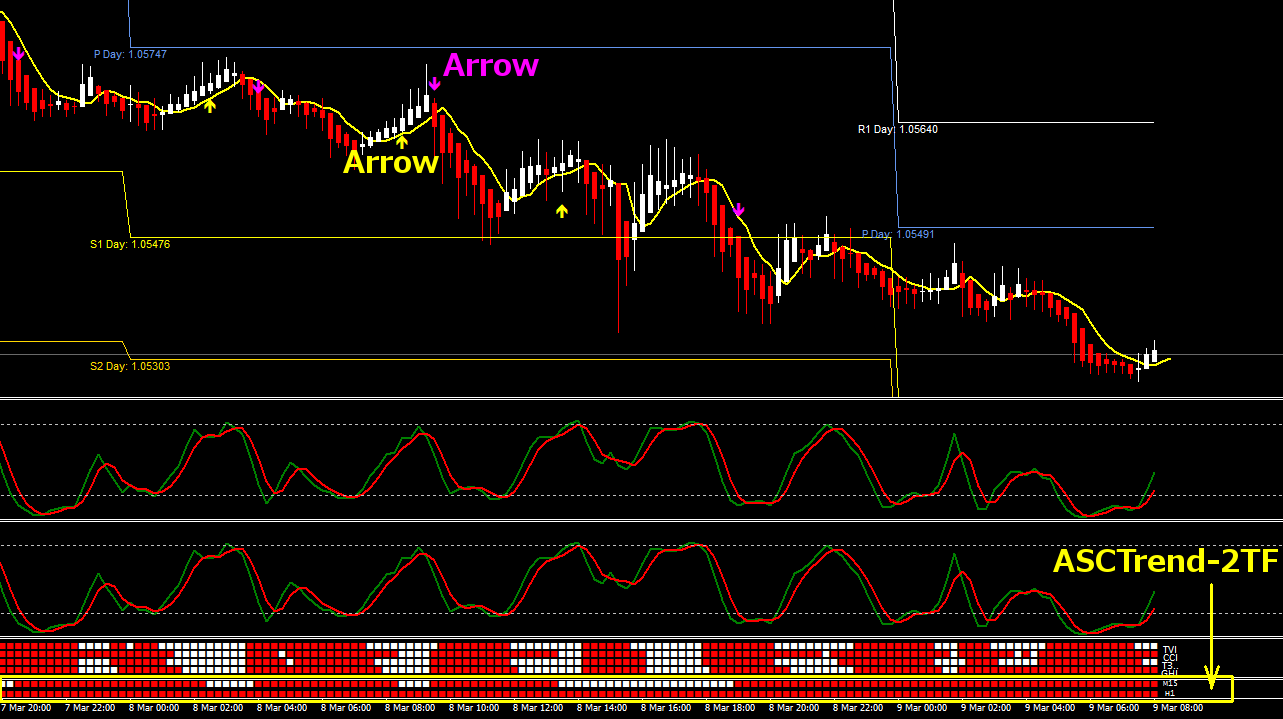 また、赤白ドットのインジケーターのうち下の方の「ASCTrend-2TF」は、表示させている時間足とその上の時間足の「2種類のタイムフレーム」のインジケーターです。