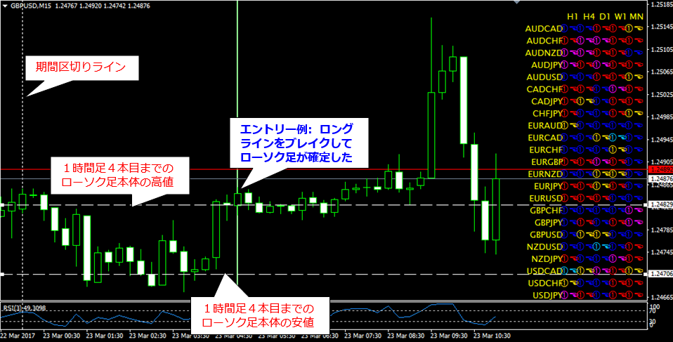他のトレーダーさんの使い方を応用して、4時間足でのエントリーポイントを待つ間に1時間足と期間区切りの表示を利用した別のトレードも紹介されているので、概要を記載してみたいと思います。