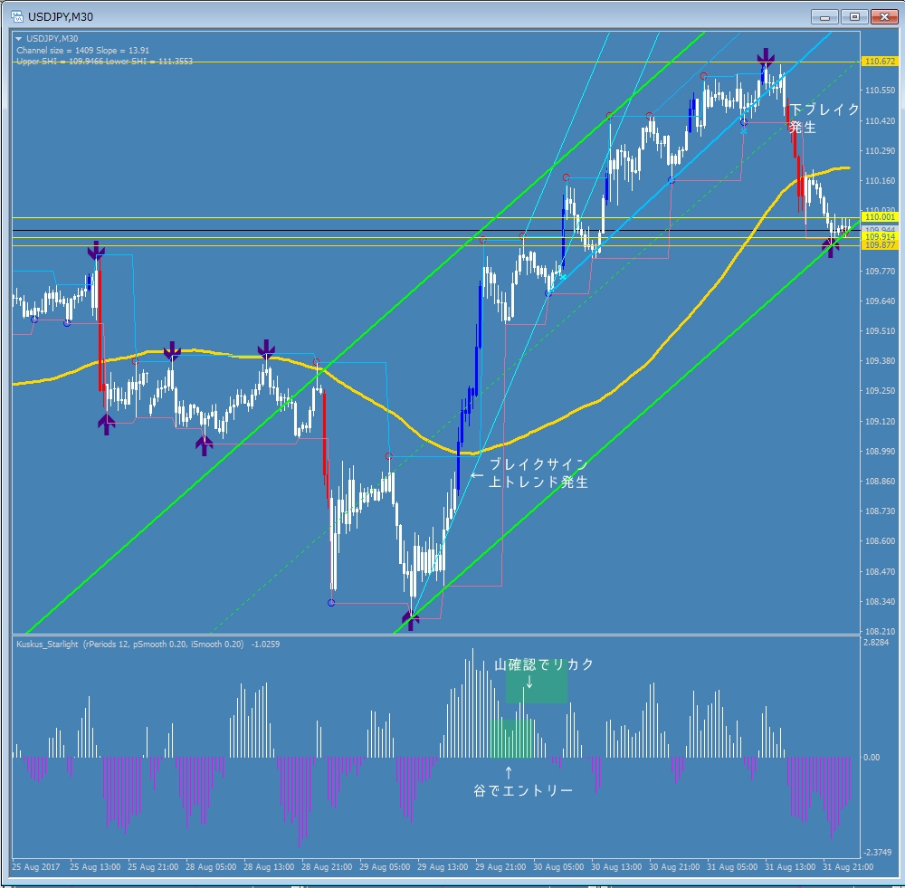 トレンドの確認方法として他には移動平均線の上か下か、チャネルの向き、「Kuskus_Starlight」が上か下かなどで判断します。